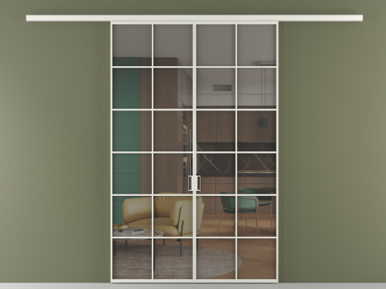 Во всех алюминиевых перегородках, независимо от типа установки, используется компланарный раздвижной механизм, благодаря которому декоративная крышка и полотно находятся в одной плоскости.
