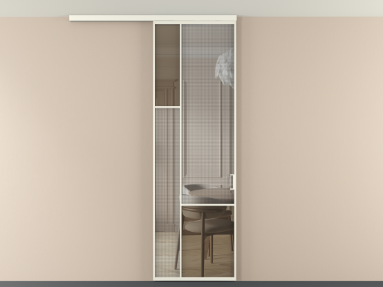 Во всех алюминиевых перегородках, независимо от типа установки, используется компланарный раздвижной механизм, благодаря которому декоративная крышка и полотно находятся в одной плоскости.
